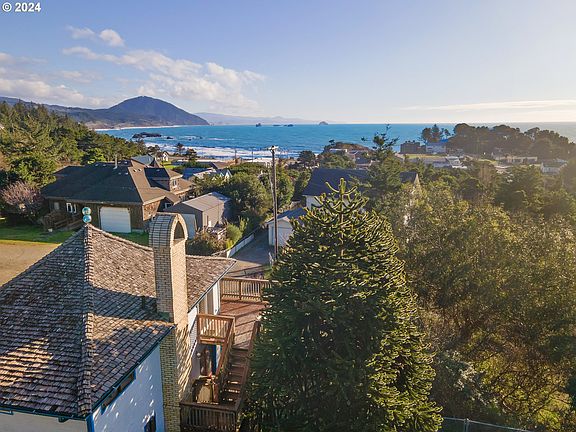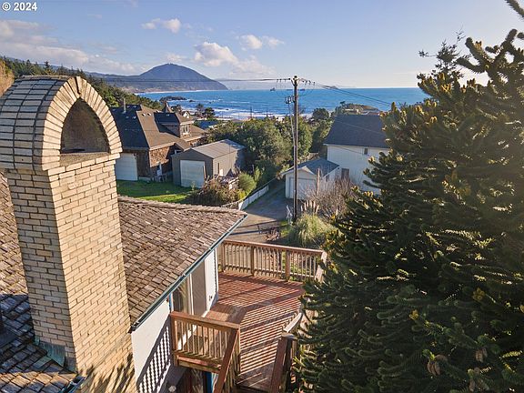 Ocean view home with bonus Pagoda style studio two blocks from Battle Rock Park. This unique custom home features custom wood accents, open beam ceilings, and ocean views nestled in a quiet neighborhood on the edge of town. Conveniently located near various restaurants and stores, enjoy listening to crashing waves and the smell of sea air. Main Floor: Kitchen/living room, family room, 2 wood stoves, bathroom with walk in tub, and master BR. this home also features a spiral staircase leading to crows nest with 2nd Br and 1/2 bath. 2nd story: Studio with full bath and kitchenette. The custom sauna is located in the basement with a 1/2 bath. Nestled on the hillside overlooking the ocean this home has coastal charm and an additional ocean view studio with income potential, it is a must see!