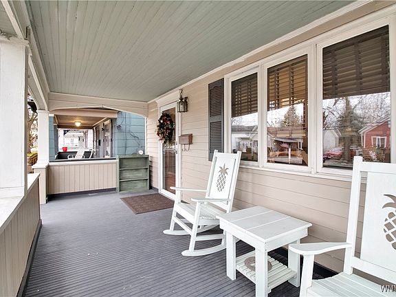 Step inside this preserved Tonawanda gem, where historic charm blends seamlessly w/modern updates. Upon entry, an inviting living space and well-maintained 42-inch staircase greet you, setting the tone of the home's timeless appeal. The hardwood floors, refinished in June 2024, showcase an intricate pattern, adding a touch of elegance to every room. An open living space w/high ceilings and a seamless flow between the living and dining areas is perfect for both everyday comforts as well as entertaining. Enhancing the architectural charm, the dining room features a classic chair rail and wainscoting, while both spaces showcase matching trim and doors, all framed by elegant wooden pillars that separate the two areas. The eat-in kitchen combines functionality w/charm, featuring tall cabinetry, a lazy Susan, leaded glass accents and undermount sink as well as updated appliances. Conveniently located off the kitchen are a half bath, access to full basement and rear entry. Upstairs, you'll find all 3 bedrooms, including the largest bedroom w/walk-in closet. The full bath, remodeled in December 2024, features white wainscoting and basketweave tile flooring as a nod to the home's original design, all complemented by a walk-in shower w/hexagon tile flooring and white tile surround. Additionally, if you're looking for bonus space, the walk-up attic offers a 30x20 area, perfect for storage or potential to finish. The home’s updates extend beyond aesthetics, including fresh paint inside and out, brand-new hot water tank (1/25), updated 200 AMP electrical service, architectural roof and boiler (2004). In addition, a new concrete driveway was installed in August 2024 along w/a new tongue-and-groove Southern pine front porch. All appliances, including washer and dryer, as well as window treatments, are included. Located just a short walk from the Niagara River, Niawanda Park and Clinton Park, this home truly combines historic charm and thoughtful updates in a prime location. Showings begin Tuesday, 1/7 @ 11am.