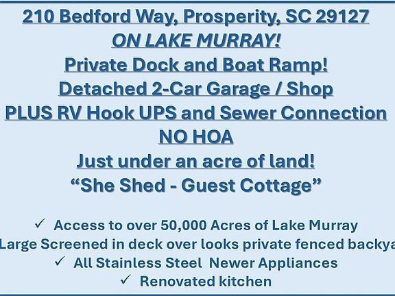 COME LIVE LAKE LIFE TO THE FULLEST! Your personal boat ramp and renovated dock in your backyard to enjoy over 50,000 acres of Lake Murray! Just under an acre with a 2-car detached garage /shop, insulated, that has RV hookups and MORE! Welcome home to this renovated bungalow home that makes the most of outdoor living with 2 deck spaces to enjoy Lake Life at it best! The open floor plan allows you to entertain and enjoy the recently renovated kitchen with newer stainless steel appliances, including a new Induction stove /oven! Enjoy the beautiful view from the kitchen. Grill out on the side deck and enjoy the cool Spring and Summer days! The great room has a fireplace to make the winter days cozy while looking out with a great lake view! Don't miss your opportunity to enjoy Lake Murray at a great price, whether using it for a weekender, an Airbnb or your primary home, you have Lake life in your own backyard with all the great details to enjoy!The Primary bedroom hosts a HUGE walk-in closet! Recent renovations include Fresh paint, updated lighting, and new appliances! Must see it in person to appreciate the details! Here is a video walkthrough to see all the great details! https://youtu.be/eqMX2az55WE?si=e2scpyE_UlQ1ZM1V Disclaimer: CMLS has not reviewed and, therefore, does not endorse vendors who may appear in listings.