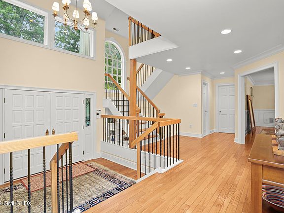 Sunny bright 5 bedrm colonial w/ spacious interiors situated on 2 private acres, only 5 minutes to town, easy commute to NYC, desirable North St school district. Soaring ceilings in entry and LR w/ floor to ceiling stone FP. Open plan kitchen and family rm provides great entertaining flow with glass doors leading to a spacious deck overlooking the wooded yard adjoining 100 acres of conservation land with trails and parks. Over-sized formal DR and office complete the 1st floor. Spacious 2nd floor has primary bedrm w/ FP and renovated primary bath, WIC. 3 additional bedrms and 2 renovated full baths. The bright lower level with high ceilings, potential bedrm and renovated bath is perfect as a nanny suite or guest apartment. Glass doors lead to the lower level deck. A naturalist dream home.