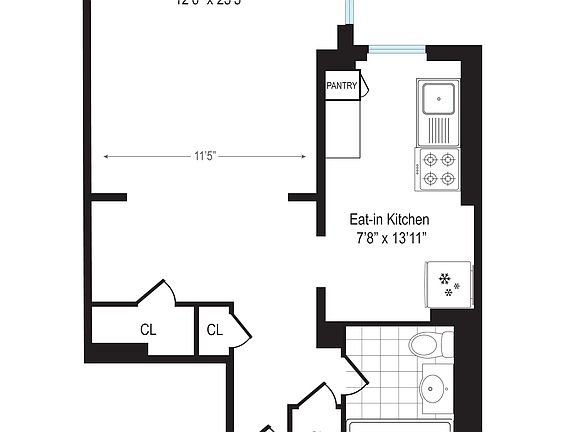 This expansive straight studio layout can easily be configured with distinct bedroom and living room areas. Airy and light filled with 6 inch higher ceilings found only on the 17th floor! Separate windowed eat in kitchen, three closets, and a retro New York style bath. Open western and southern views toward the downtown skyline.