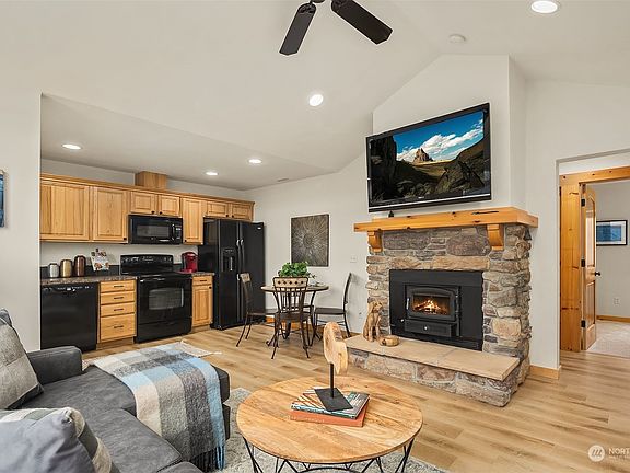 Discover the perfect getaway in a year-round paradise! Awash in new paint and updated throughout with new luxury vinyl plank flooring and carpet, this home is truly turn key. Enjoy the changing seasons from your covered front porch protecting from the elements no matter the time of year! Cozy, wood burning fireplace and attached 2 car garage for all your toys. New hot water tank installed in 2021 and A/C installed in 2022. Incredible investment opportunity awaits, with the potential for lucrative short-term rentals. The clubhouse is a fantastic perk to an already fabulous location near winter snowmobile trails and summer water activities, Lake Cle Elum is less than a mile away! Don't miss your chance to own a slice of vacation heaven!
