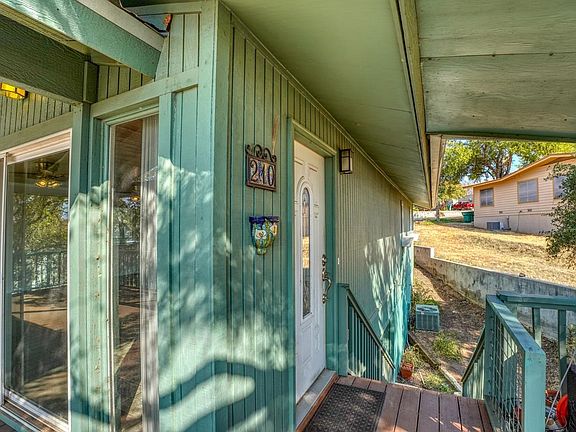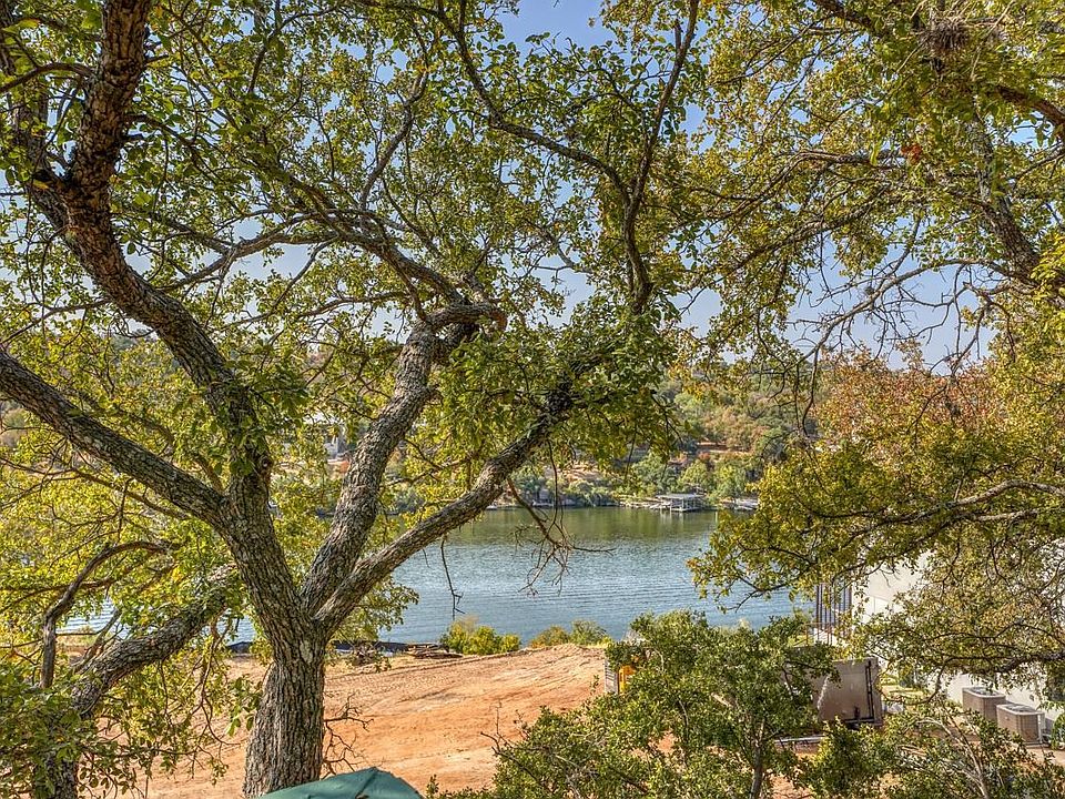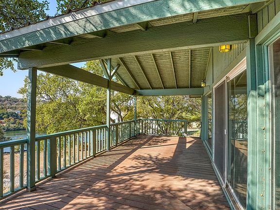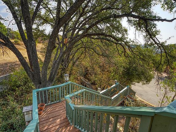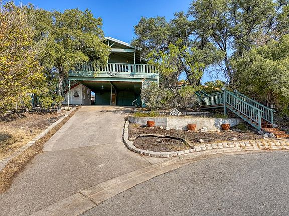 Amazing views found here in this unique home in central Marble Falls overlooking Lake Marble Falls and the Colorado River basin! Experience the treetop feeling as you can view the upper river basin and the distant hill country area from this special home. Large covered front porch allows for perfect outdoor entertaining and the ability to revel in nature's bounty all around. Massive windows allow spectacular views from the Great Room of the open floorplan home on the second level. This open space includes tile floors, bead board ceilings, and an open concept Living, Dining, and Kitchen. The kitchen island serves as the only dividing space in this large open footprint. The kitchen is equipped with white appliances including a french door refrigerator, tile countertops, and a plethora of cabinets for storage. Upstairs is also the home to two bedrooms and one bathroom. You can access the Primary Ensuite either by the staircase down or by the front entry, ground level floor with no need for stairs. The downstairs consists of a large entry/landing, primary bedroom, primary ensuite bathroom with a soaking tub and separate shower, and large walk-in closet. The double covered parking will hold 4 vehicles, tandem. There is also additional storage at the covered parking area. The large slightly sloping lot runs street to street from Cliff Circle to Avenue D. There is a nice storage unit with a window unit & water availability, with large front deck, on the Ave D side of the almost 1/3 of an acre lot. Check it out!