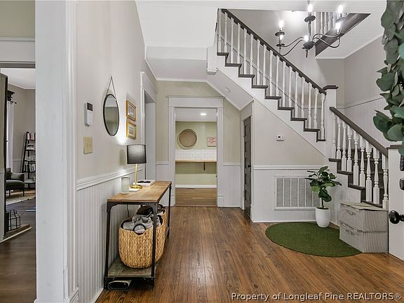 Step into timeless elegance with this meticulously renovated 1920s gem in Fayetteville’s historic Haymount district. Set on a .35-acre lot, this home seamlessly blends historic charm with modern comforts. Preserving its historic allure, the home showcases original doors, vintage-style handles, exquisite moulding, and refinished hardwood floors adorn the foyer. A carefully restored cast iron bathtub and vintage-style tile add a touch of nostalgia to the freshly appointed bathrooms. The main level features a spacious great room and formal dining area. The first-floor primary suite boasts a new ensuite bathroom and walk-in closet. A grand staircase and incredible chandelier highlight the foyer. The updated kitchen offers new cabinets, subway tile, and an eat-in area. Upstairs, a loft, renovated full bathroom, and two carpeted bedrooms await. Four decorative fireplaces enhance the home’s charm. Own a piece of Fayetteville’s history, where classic charm meets contemporary luxury.