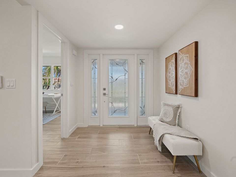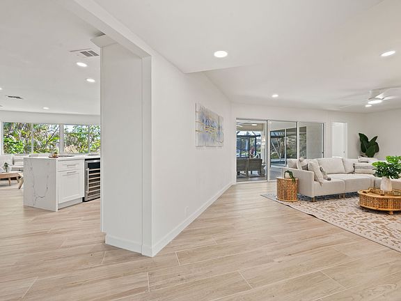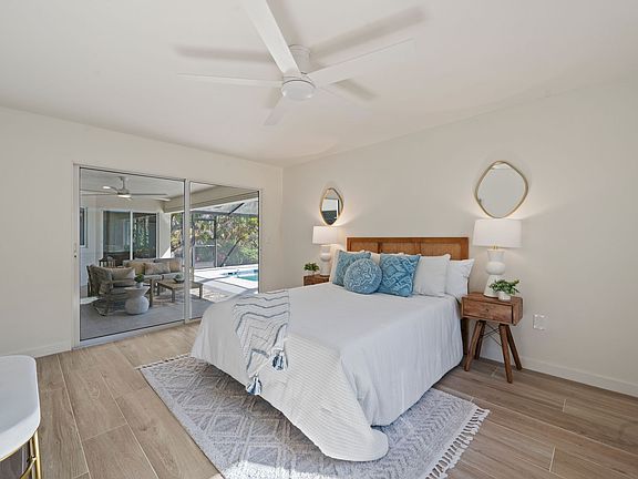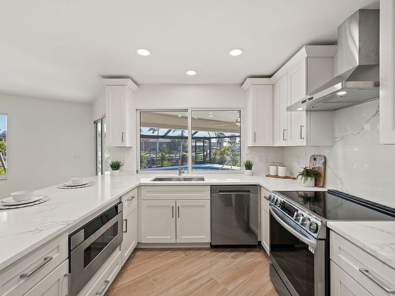 Welcome to this beautifully updated waterfront home in the desirable Punta Gorda Isles, located on a spacious SALT WATER canal. Offering direct access to open waters in under a mile with NO BRIDGES, this property is perfect for all boaters, including those with sailboats. This home sits on high elevation and has NEVER FLOODED. It has been completely modernized with luxury in mind. Updates include NEW porcelain tile flooring throughout, NEW A/C unit, NEW electrical panel, and NEW recessed lighting, creating a bright, modern atmosphere. The chef's kitchen is a showstopper, featuring NEW custom cabinetry, NEW stainless steel appliances including a wine fridge and NEW quartz countertops with a striking waterfall edge, perfectly complemented by a matching quartz backsplash. Both bathrooms have been fully reimagined and updated, boasting NEW all-wood shaker vanities, NEW quartz countertops, and NEW elegant tile on the bath and shower walls, accented with luxurious marble herringbone designs in the niches and on the shower floor. Indulge in a NEW soaking tub, NEW rainfall and waterfall fixtures, as well as NEW sinks and toilets throughout the home. Step outside to an entertainer's dream with a NEW panoramic pool cage surrounding a spacious 16' x 28' HEATED POOL. The recently updated lanai with NEW tile makes it the ideal setting to enjoy Florida's stunning sunsets and relax in style. This home has been freshly painted inside and out and is surrounded by lush, low-maintenance landscaping, enhancing its curb appeal. Other key features include 54 feet of waterfront with a large cement dock equipped with water and electricity, a concrete seawall maintained by the city, and public water and sewer connections. This property is nestled in a wonderful neighborhood with friendly neighbors, and it's just minutes away from downtown Punta Gorda, which offers an array of shopping, dining, waterfront parks, and lively events all easily accessible by bike. Additionally, some of the best beaches in Florida are only a short drive away. Don't miss your opportunity to own this completely updated luxury waterfront home in one of Florida's most sought-after locations.
