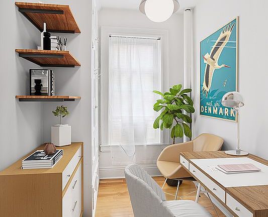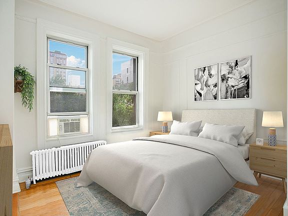 The generous living room boasts an extra-large window with city views and overlooks iconic brick townhomes. The expansive living area connects to a similarly large dining room with two tall north-facing windows, ensuring gorgeous natural light throughout the day. The primary bedroom features French doors, accommodates a queen-size bed, and includes a substantial floor-to-ceiling closet, a south-facing window, and built-in shelving for storage. The second bedroom is suitable for use as a guest room, nursery, or office and contains an original built-in closet with drawers and overhead storage, complemented by an east-facing window for morning and afternoon sunlight.