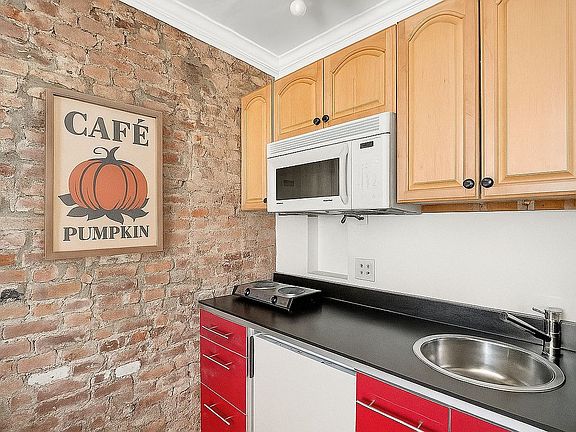 Step inside this southern exposure home and be instantly drawn in to it's character and charm. Nestle in your cozy home with an exposed brick fireplace, a warm and inviting centerpiece rarely found at this price. The character continues into the kitchenette, with matching brick detail that defines the space while offering a fridge, microwave, countertop burner and cabinets for smart storage.
