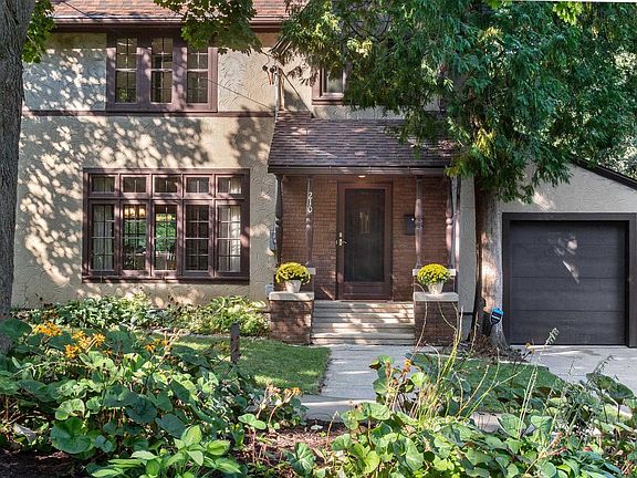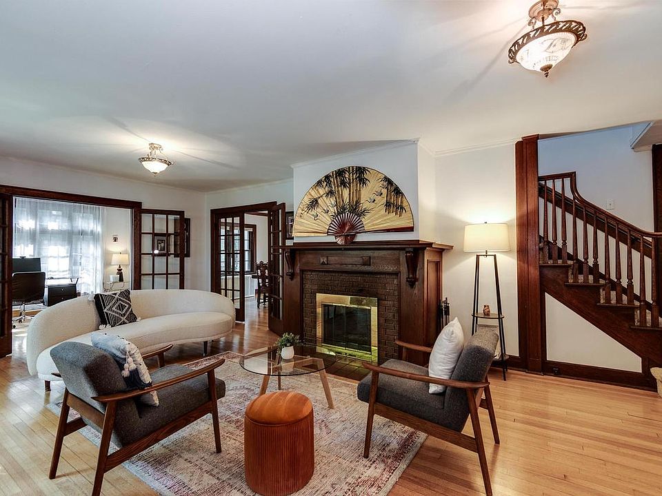 Finished lower levelStorybook casement windowsDouble glass french doorsOriginal architectural detailsGorgeous natural woodworkBrick fireplaceAmple storage