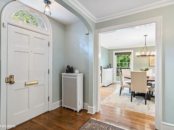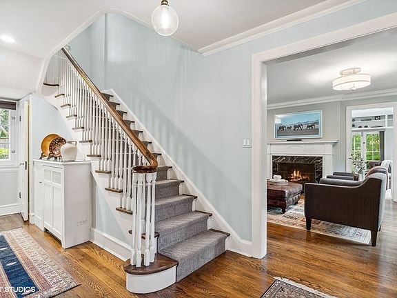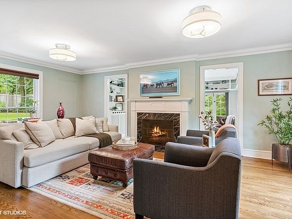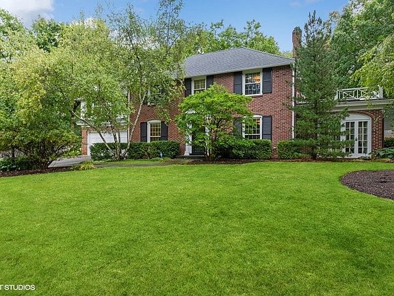 Timeless elegance meets modern comfort in East Glencoe. Nestled on a lush 1/3 acre along one of Glencoe's most sought-after streets, this brick center entry colonial exudes charm. As you step through the elegant foyer, you're greeted by the spacious living room with gas fireplace and beautiful dentil molding. Which leads you into a sunlit library with custom built-ins, surrounded by floor-to-ceiling windows and a sliding door to the patio. The heart of the home is a custom designer kitchen, with a walnut-topped island, high-end appliances, quartzite countertops, marble backsplash and pantry with pull-outs. Flowing seamlessly into the family room with vaulted ceilings, skylights, and access to a bluestone patio with built-in grill. The mudroom with board and batten paneling connects you to the heated two-car garage and additional storage space. The upstairs includes a gorgeous primary suite with abundant windows, built-ins, walk-in closet with washer/dryer and luxurious bathroom with double vanity marble countertops and flooring, soaking tub and separate shower. As well as three additional bedrooms with custom organized closets and full hall bathroom. The third level offers a special treat with office space, amazing views of the yard and a powder room. To complete this haven a walk-out basement with recreational space, great storage and a second laundry room. Enjoy outdoor living at its finest with a spacious bluestone back patio, built-in grill and ample green space with sprinkler system. Just a few blocks to the lake, town and train. Your dream home awaits.