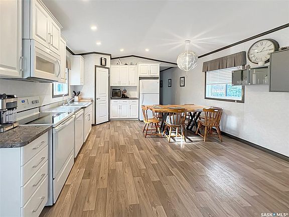 Discover the serene charm of Neville, SK, a peaceful community that offers a tranquil atmosphere, close to Swift Current and a mere 20-minute drive to the picturesque Lac Pelletier Lake, a premier destination for summer recreation. This expansive property, encompassing three town lots, features a mature shelter belt that ensures privacy, a delightful play structure for children, and ample parking space, providing the perfect setting for relaxation and outdoor activities. The residence includes a modern 2019 mobile home, showcasing insulated skirting and durable vinyl siding. It is equipped with a forced air propane furnace, which can be converted to natural gas, and has been prepped for the installation of a central air conditioning unit for added comfort. The thoughtfully designed layout is ideal for family living, featuring an open-concept kitchen, dining, and living area that promotes a sense of togetherness. In the airy kitchen, you will find elegant white cabinetry, contemporary countertops, a dishwasher, and sufficient space for a large dining table, making it perfect for entertaining. One side of the home accommodates two generously sized bedrooms and a four-piece bathroom. On the opposite side, find your laundry room/utility room with access to the exterior. Here you will also find the spacious master bedroom measuring 12.2 x 14.7 feet including a three-piece ensuite and a walk-in closet, offering a private retreat. Throughout the home, durable vinyl flooring and a modern colour palette create a cohesive aesthetic, complemented by numerous windows that flood the spaces with natural light, enhancing the airy ambiance. This property is an exceptional opportunity for those seeking a blend of comfort, space, and community in a desirable location. Call today for more information or to book your personal viewing!