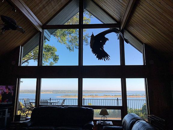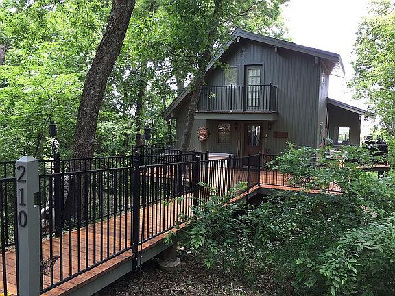 210 Island View is a compact gem of a house, thoughtfully laid out, surprisingly spacious, with a lake view that will leave you breathless! You park in the circular gravel drive and approach the house through a secure gate to a large shaded deck with room for two tables and extra seating. Open the door and the first thing you see is Lake Texoma! But you take your time and notice the spacious kitchen. with granite countertops and breakfast bar as you make your way to the large, inviting den/dining area. Then let your eyes return to the 135-degree lake view through a 20-foot peaked wall of windows. Walk outside to another large deck, mostly shaded, with room for outdoor cooking, dining, and observing the lake and the islands. Upstairs is the master suite. It’s compact. There are built-ins, a good size closet, and access to a 6x10 storage area. Downstairs you’ll find a huge game room with a pool table, a large bedroom, bath, and an alcove that you can use as an office or day bed. It’s currently set up with beds for 6-8 guests. You’ll love this house if you love natural light, the warmth of wood, and treating your guests to spectacular lake views in any weather. From a practical standpoint, you’ll love the low maintenance and low electrical bills. The walls are 6" thick and lined with cedar or pine. But you wouldn’t buy this house for practical reasons, you’d buy it because this is the lifestyle you’ve earned. Come have a look!