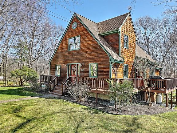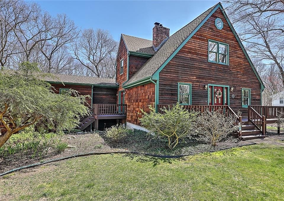 Quality Contemporary Cape in the desirable Hope area of Coventry. This beautifully cared for home sits on almost 3 acres of land with a large outdoor shed, mature landscaping and a raised bed garden. The house has 4 bedrooms and 2 full baths with a 3rd bath roughed in on the second floor. The first floor has a large primary suite with a huge walk in closet and tiled bath with a soaking jacuzzi tub and glass door shower. There is another bedroom and full bath as well on the first floor. The living room is open to the dining area and has a stone fireplace with a wood stove insert for supplemental heating. The eat in kitchen has GE profile stainless appliances, wood cabinetry, and granite counters. The deck off of the kitchen is convenient for grilling or just watching your garden grow. There is another room currently used as an office with another deck overlooking the back yard. There are beautiful hardwoods throughout the living area of the first floor. The second floor has two generous sized bedrooms and a space for a full bath that is roughed in already. There is a large landing open to the dining area below giving the house an open, spacious feel. The full walk out basement has tons of potential if you need more living space and a 2 car garage. This home is in excellent shape. Don't wait to see this one....it will not be on the market long!