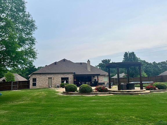 Step into paradise in this stunning custom-built home just minutes from Longview in Hallsville ISD, outside Longview city limits. This beautiful 4- bedroom 3-bath home has all the perks and amenities you could ever want or need. The living room has a wood burning fireplace that has never been used. The entire home is equipped with a state of the art lighting system, recessed lighting through the entire home, plus upgraded light fixtures in kitchen and dining room. The kitchen was remodeled with new granite, cabinet hardware, backsplash, cooktop, and dishwasher in 2023. The floors are pecan-stained hand scraped hardwood throughout the main living space. Crown molding throughout the home, as well as double paned energy efficient windows. You have your own backyard oasis that features two custom pergolas, recently refinished and stain, a in ground gunite pool perfect for family gatherings, birthday parties etc. This property is located on a 1.1 acre lot in Branch Estates subdivision with an HOA amenity. The entire property is landscaped including the beautiful flower beds skirting the perimeter of the pool. This home is applicable to all family styles whether you have kids ready to run, jump, play and swim in the perfect backyard or adult only looking for a night swim with a quiet community to take an evening stroll in. The outdoor veranda is also perfect for sunset watching as the sun sets behind a filter of beautiful pine trees. There is also a built in stone fire pit in addition to those amenities.