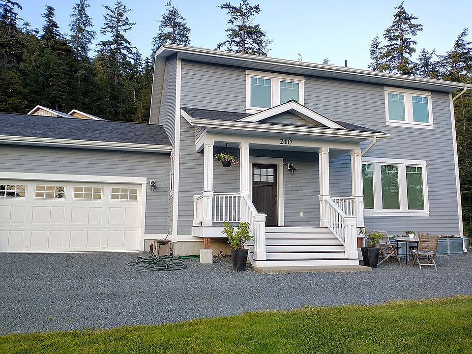 6-star energy efficient. Radiant heat throughout. Twin Air to Water Daiken Heat pump provides domestic and space heating. Triple pane windows. Whole house HRV system. Exterior insulation. Floors are hardwood. Oak stairs. Large master bedroom with vaulted ceilings. 3/4 inch tongue and groove painted pine interior. Master bath has soaking tub, walk-in shower, dual vanity and walk-in closet with custom shelving. 4 foot hallways, 9 foot ceilings on the first floor and 8 foot ceilings on the second floor. Tiled showers and floors in the bathrooms and laundry/mudroom. Epoxy floor in the garage and lots of custom shelving. Stainless steel appliances, propane range/oven. Large stainless farmhouse sink. Concrete countertops in kitchen, pantry and utility room. DeWils shaker style white cabinets with plywood box frames and maple dove tail drawers, they are also soft close. 7'x5' kitchen island with bar. Large walk-in pantry with custom storage and counters. 8' concrete stem-wall with crawl space. 96 SF covered front porch with Trex decking. 112 SF 2/3 covered back porch with stair access off dining room. Cement siding with custom window trim. Architectural asphalt shingles. Lawn and rock landscaping. 3 car parking alongside the garage.