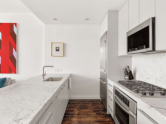 Enter into a generous foyer with two gallery size walls, a pantry and storage closet and room for coat hooks that leads to an expansive open plan layout with the east-facing façade, featuring oversized picture frame windows that capture an incredible view down Kenmare Street including the Williamsburg Bridge. They fill the space with natural light with built-in window seats perfect for weather and people watching on vibrant Kenmare Triangle. The layout blends striking interiors with comfort and functionality, anchored by a custom renovated kitchen appointed with high-end appliances, sleek cabinetry, and generous prep space. Sophisticated existing furnishings are available for additional purchase for a seamless move-in.