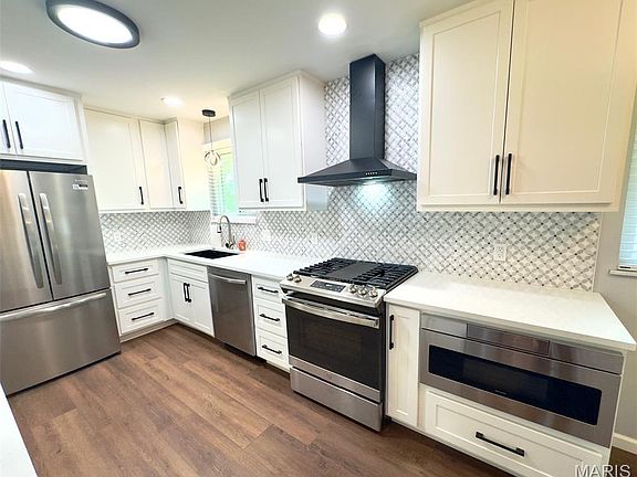 Step into this beautifully renovated ranch-style home featuring 3 bedrooms and 1 bath, nestled on a spacious 0.28-acre corner lot in the Terra Mariae subdivision. As you enter, you're welcomed into a bright living room with fresh paint and new wood laminate flooring that flows throughout the main level. The fully remodeled kitchen boasts all-new appliances—including refrigerator, stove, microwave, and dishwasher—alongside new cabinets, fixtures, and finishes. Down the hall, you'll find three comfortable bedrooms with new windows, blinds, and light fixtures, and a completely updated full bathroom with modern touches. Every detail has been thoughtfully upgraded, including new interior and exterior doors, a new roof, gutters, mailbox, porch light, and new breaker panel in the basement. The full basement offers freshly painted walls and floors, perfect for storage or future expansion. Located in the Ft. Zumwalt school district and close to parks, shopping, and highways, this move-in-ready home blends style, comfort, and convenience.