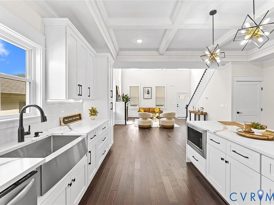 Cozy gas fireplaceFarmhouse sinkDesigner finishesQuartz waterfall countertopsWalk-in pantryGas stoveVaulted ceilings