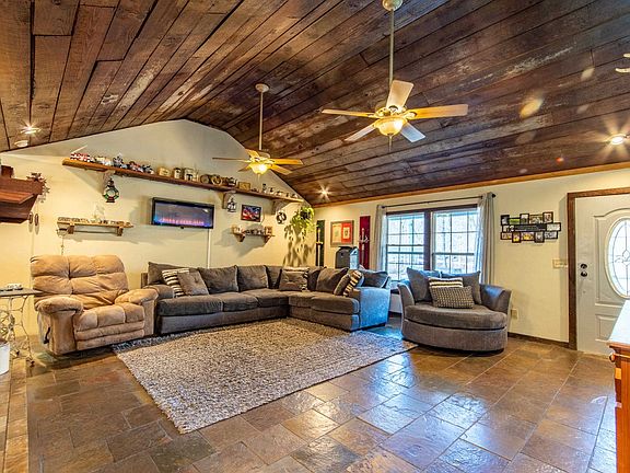 Want privacy? A gated drive & gorgeous bridge bring you right to your cabin style home...nestled on 4.74+/- wooded acs on Turkey Creek! The wood burning fp is the star of the show in the spacious liv. room w/vaulted ceilings. The kitchen offers plenty of cabinet/counter space, an island, & all app. including the washer & dryer. A spacious primary suite offers a custom tile shower, dbl vanity, & wic. Take in all the wildlife from the sunroom or deck! Greenhouse, chicken coup, & fruit trees too!