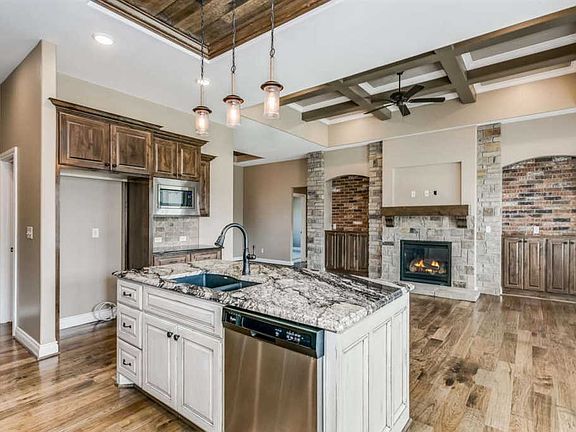 Gorgeous home in the desired Woods addition! This impressive home features a beautiful front door and entrance. When you walk in, you will see a stunning open floor plan that includes the family room, kitchen, and dining area. The living room features a gorgeous stone fireplace, with a vaulted and beamed ceiling. The kitchen has an impressive granite oversized island and granite countertops. You will love the huge walk-in pantry as well. A lovely feature you will notice from the dining area, through the large windows is the covered deck. The split bedroom floor plan includes a fabulous master bathroom with 2 separate granite topped vanities and sinks, large soaker tub and zero-entry walk-in tiled shower. The huge walk-in closet also walks conviently through to the laundry room. The main floor also includes the 2nd and 3rd bedrooms with a nice bathroom. The walk-out and view-out basement is ready to finish as you like it. It does have the rough-in for the 3rd bathroom and the wet bar rough-in and plumbing are done for you. The exterior includes sprinkler system, irrigation well, landscaping and a covered desk to enjoy the outdoors! Come view this beautiful well built home!