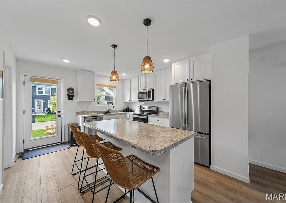Stunning, modern 1 year old end unit townhouse in the sought-after Streets of Caledonia Neighborhood! Low Maintenance living loaded with neighborhood amenities conveniently located in Winghaven! Open floorplan, SS appliances, 42' cabinets, Luxury vinyl plank flooring, modern light fixtures throughout and a 2nd floor laundry room all wrapped up in a 1-year-old home! Three spacious bedrooms await you upstairs with the primary bedroom having its own primary suite and your laundry room around the corner. Eat-in kitchen with island seating, lots of countertop space & a window overlooking your back patio area. Basement features an egress window, plenty of storage space and another bathroom rough-in. Upgraded blinds throughout the home for added privacy. Neighborhood pool, clubhouse, playground AND pickleball courts - something for everyone to enjoy!