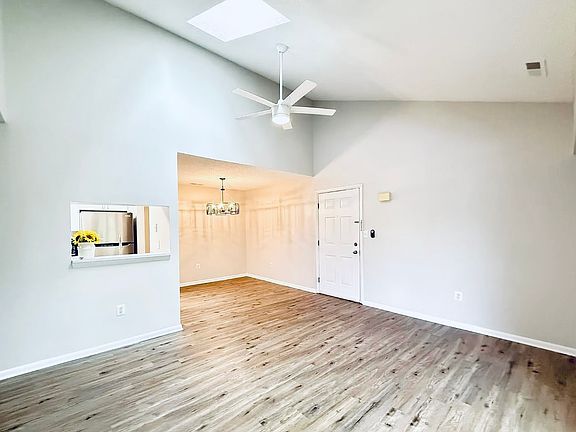 The spacious family room features vaulted ceilings, skylight, and a ceiling fan, creating a bright and open living space.