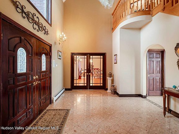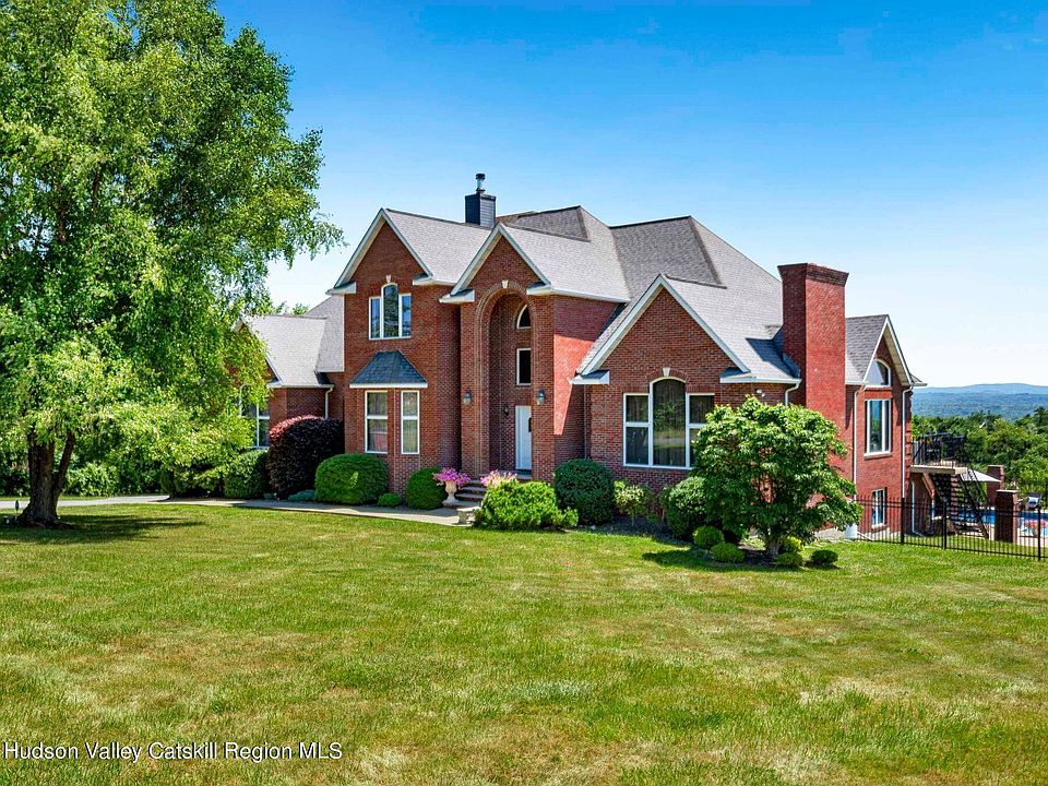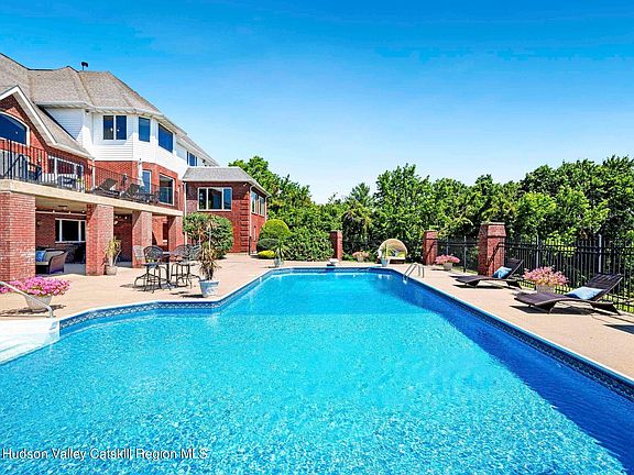 Wide open spaces, inside and out! There are some searching for homes in the Hudson Valley and Catskills region that are looking for a cozy little cottage in the woods, with 1,000 square feet or so and perhaps a shed. Then, there are some who NEED space - floor space, headroom, wide open walls to display large pieces, outdoor entertainment spaces for a CROWD, and views to an endless horizon filled with mountains. 210 Ridge Road in Marlboro is for the second set! This incredible 4 bedroom, 2 bath luxury home has 5198 square feet of living space with high ceilings, breathtaking views, high-quality finishes, huge windows, and interesting architectural angles. Built to last in 1997 in beautiful brick, this was a reputable builder's own home - it shows in the details. Enter to an impressive 2-story foyer. On the right is a den with a fireplace set into a stone wall - it's both dramatic and welcoming; to the left, a grand living room and dining area with space for several conversation areas. A wonderful cherry wood kitchen, designed to make gourmet cooking stress-free with double ovens, pantry cabinets, a coffee/bar/serving station, and an island, anchors the corner of the open-plan breakfast/family room that runs the of the back of the house to capitalize on the truly stunning views of the mountains across the Hudson River. From there, step out onto the deck for an even better view of the mountains, plus the in-ground lap pool and patio, and the properties' professional landscaping. Below the deck is a covered patio accessed from the lower level with space for a bar and an outdoor living room. The 3-car drive-under garage and expansive, paved driveway keep the property looking neat, even when you're entertaining multiple guests. The second floor has 4 bedrooms with vaulted ceilings. Multiple hallway closets offer plenty of storage. The primary suite (with the views) has two walk-in closets as well. Set on 1.71 acres in Marlboro, 210 Ridge Road is the perfect place to call home if convenience is important to you - it offers the best of The Hudson Valley; the views and the property connect you to the nature that draws people to the valley, while the proximity to the NYS Thruway, Route 9W, and the Newburgh-Beacon bridge means it's easy to drive, or catch a plane, train, or bus to anywhere. Marlboro is one of the most accessible locations in the region. If space is what you're after, don't hesitate - book an appointment to take a tour of the house and neighborhood now.