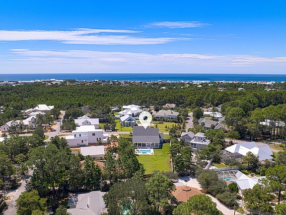 Rare 0.57-acre 30A retreat in Santa Rosa Ridge. Custom-built by Randy Wise Builders. Just a half mile from the Gulf and 40+ feet above sea level. Enjoy 10-ft ceilings, open floor design, luxury kitchen, 10-ft island, walk-in pantry, and ceiling-height custom cabinetry. The dining area opens to a spacious lanai, with room for lounging and outdoor dining overlooking the pool. The Primary Suite offers dual vanities, dual custom walk-in closets, and a 50-sq-ft heated shower. Main floor includes a guest suite and flex room. Upstairs: a wet bar including bev. cooler and ice maker, two bedrooms, and a 350-sq-ft entertainment room. Heated/cooled 3-car garage, year-round heated pool and spa. Plenty of space for boat/rv storage. Enough space to build a future Carriage House, Pool house etc. NO HOA