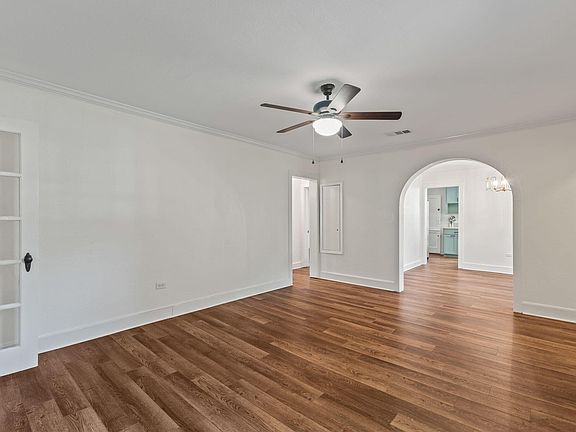 The living area is so welcoming with plenty of natural light, built-ins, a decorative fireplace, and a beautiful arched doorway leading to the formal dining room. The kitchen offers stainless appliances, a gas range, and new, handmade custom cabinet doors.