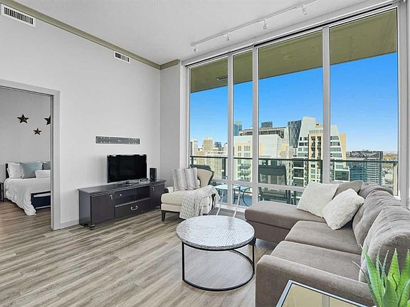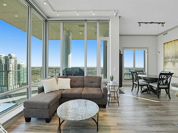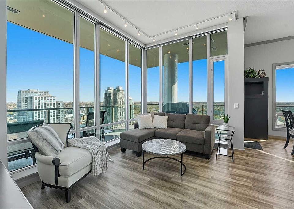 Welcome to Vetro, one of Calgary’s most sought-after high-rise condominiums, ideally located in the heart of the Beltline. Perched on the 32nd floor, this stunning 2-bedroom, 2-bathroom corner unit offers nearly 965 sq. ft. of modern living space with spectacular south-facing city and mountain views through floor-to-ceiling windows. Step inside to discover a bright and open layout featuring contemporary finishes throughout. The kitchen is equipped with sleek cabinetry, stainless steel appliances, granite countertops, and a convenient breakfast bar—perfect for entertaining or casual dining. The adjoining living and dining area flows seamlessly onto a private balcony, ideal for enjoying your morning coffee or the evening skyline. Both bedrooms are generously sized, with the primary suite offering a walk-through closet and private 4-piece ensuite. A second full bathroom, in-suite laundry, and central air conditioning add comfort and convenience to this well-designed space. Vinyl and tile flooring throughout ensure durability and style. This property includes 2 titled underground parking stalls and an assigned storage locker. Move-in ready or an exceptional turn-key investment opportunity. The Vetro building provides an array of amenities, including a fitness centre, sauna, hot tub, social and games rooms, and 24-hour security. Perfectly positioned steps from Stampede Park, the LRT, restaurants, shopping, and downtown, this location blends vibrant urban living with effortless access to everything you need. Enjoy the best of Beltline living—modern comfort, unbeatable views, and premier amenities—all from your sky-high retreat in Vetro.