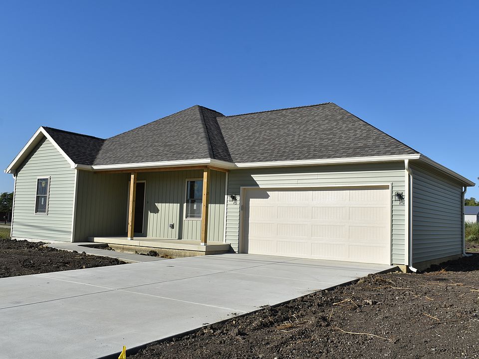Quality built by local builder with better than average materials! Located in town, but with country views offering covered front porch facing east perfect morning coffee. Super open floor plan everyone wants, solid surface kitchen countertops & quality soft close cabinets with dovetail drawers, master suite with walk-in shower, main floor laundry, full basement w/egress window & rough-in for bath whenever you're ready to finish the basement! Private patio in back for grilling & relaxing.