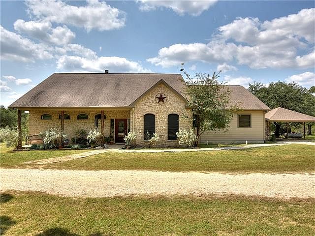 Beautiful hill country home on 11+ acres. A lovely place to enjoy privacy & nature. Spacious master has his/her walk-in closets, double vanity, jetted tub, sep shower & access to the covered back porch. Office w/half bath, living w/rock fireplace & gas logs. Silestone counters in kitchen & tile flooring thru out. Back yard has Koi pond, fruit trees, fenced garden area, 50x40 barn for workshop w/room for cars, RV/boat & additional 2 car carport. Screened & covered porches, wet weather pond & large Oaks.