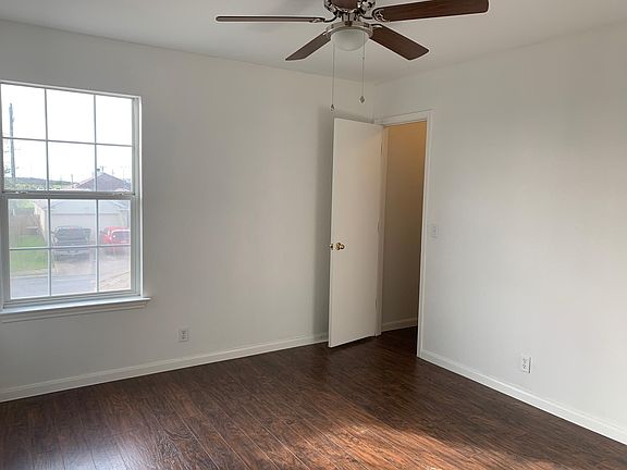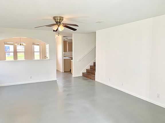 Updated 4 bedroom, 2.5 bath home with large living and 2 dining areas. No carpet with stained concrete floors downstairs, wood like flooring upstairs, and fresh paint. Stainless steel appliances in the large kitchen with tons of cabinetry and storage. Fireplace in the living room, nice master suite with separate tub & shower, plus a double vanity. All new tile flooring in both bathrooms upstairs. Ceiling fans in all of the bedrooms. Full size washer/dryer connections. Huge fenced backyard with a spacious storage building w/electricity. Minimum 1 year, but flexibility for longer lease option.