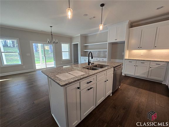 Craftsman style open floor plan, 4 bedroom, 3 baths, large open great room with brick accent fireplace and bookcase accents, kitchen has large island, walk in pantry, double ovens,stainless dishwasher, microwave and stove, walk in pantry, custom lighting throughout, laundry room has built in cabinets, master suite has custom trim package, tile master bath, large walk in shower, separate soaking tub, granite countertops, side entry 3 car garage, private lot, covered rear patio, warranty. Home is complete! Chestnut Pointe Plan