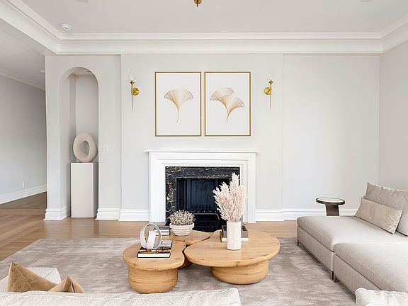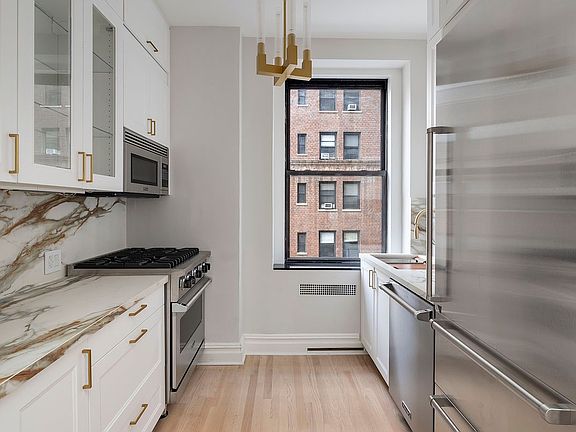 The windowed kitchen offers a Sub-Zero refrigerator, Viking stove, dishwasher and microwave, Kraus faucet with pull-down sprayer and matching water purifier, Levantina Spanish sintered stone countertop and backsplash, along with gorgeous hardwood flooring and undermount task lighting. The en-suite primary bathroom boasts a Grohe shower system with handheld Porcelanosa wall tiles, rebuilt step-in stall shower with custom door, and medicine cabinet with built-in touch-control integrated light, USB ports and a defogger; the secondary bathroom is designed entirely with Porcelanosa large format tiles. Other goodies include a new tub with marble surround, two-sided glass tub shower door, minimalist wood vanity, granite window sill and the same Grohe shower system as the primary bathroom, along with a larger version of the same medicine cabinet. There’s also a linen closet directly across the hall. In the living room, perks include custom-designed mantle around the WBF, along with Nero absolute granite where the hearthstone used to lie (all the window sills use this stone as well!); restored electrified sconces on the fireplace wall; newly redone electrical and plumbing throughout (!); recessed lighting; original hardwood floors restored to their original grain, and restored/replaced historically respectful crown and base moldings throughout. No expense or touch was spared! #4J is truly the perfect marriage of classical mastery and bespoke modern upgrades.