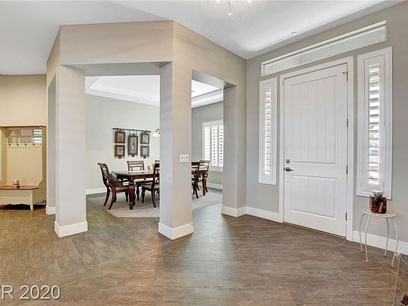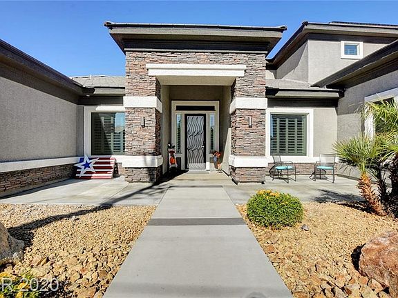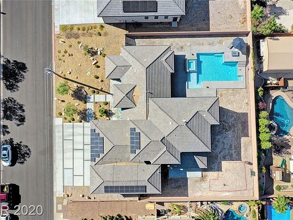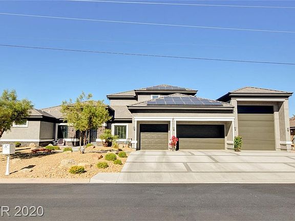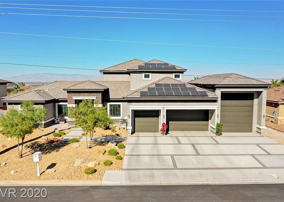 Welcome to this beautiful 4,300 sq ft custom home on a over 16,000 sq ft lot. Enter on to wood-like porcelain tile that runs throughout the home with upgraded carpet and 5" base boards . The large kitchen has solid wood cabinet with quart countertops and stainless appliances. Primaries suite is down stair and has a deluxe bath w/ oversize soaker tub and shower w/ bench. Guest suite with bath downstair and 2 large bedroom with jack & jill bath upstairs just off the huge double loft area with great Las Vegas views and pre-plumbed for wet bar. Out side has a large L shaped covered patio, a 26x42 large pool with tanning shelf, raised spa and raised fire pit with still tons of yard space. In addition to the 3 car, we also have a RV garage or stack up 3 additional cars or toys as you need. Paid for Solar Panels with back up battery