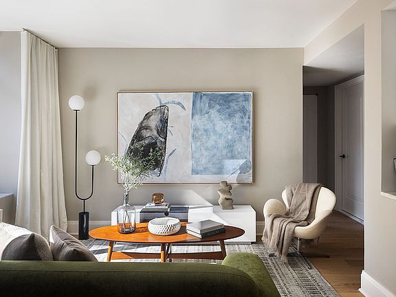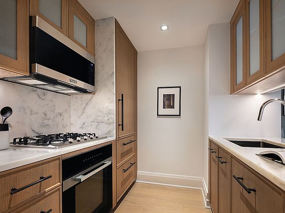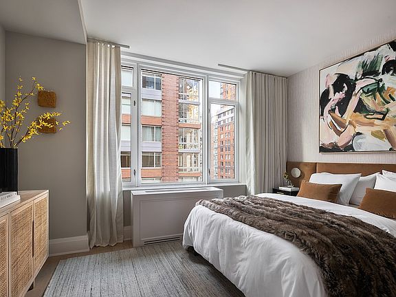 Eastern exposures featuring tranquil Battery Park and city views create a welcoming sun-filled one bedroom/one bathroom Residence 15C. This 638 square foot home features meticulously detailed and beautiful interiors by Robert A.M. Stern including 7-inch-wide plank white oak flooring and windowsills highlighted with Turkish Cristallo stone slabs. The thoughtfully planned residence is accented with a custom kitchen featuring Miele appliances, crisp oak cabinetry with dark antique bronze hardware and honed marble counters and backsplashes. The gracious living room boasts tree-lined views with space for entertaining and a formal dining table. The bathroom features a custom designed vanity clad in handsome stained oak, Lefroy Brooks polished chrome fixtures, Statuary white marble countertops, honed marble floors with custom trim in Grigio Nicola marble, and a Cantrio bathtub. Residence 15C is also equipped with smart thermostats, a washer/dryer and non-toxic/low VOC finishes used throughout.