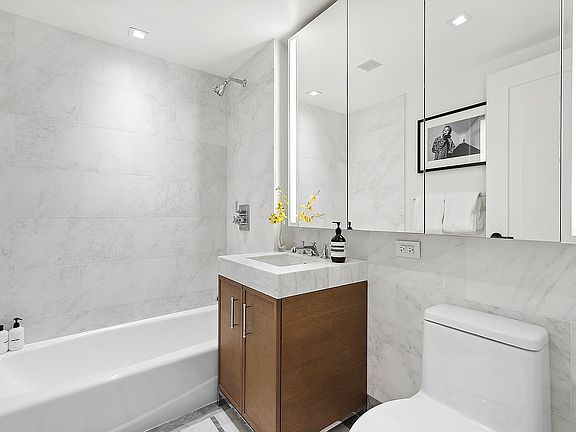 Sun-drenched split two-bedroom, two bathroom corner Residence 5G features south and east exposures with tree top views. This meticulously detailed 1,120 square foot residence with beautiful interiors by Robert A.M. Stern include 7-inch-wide plank white oak flooring and windowsills highlighted with Turkish Cristallo stone slabs. This residence features a custom kitchen with Miele appliances, crisp oak cabinetry with dark antique bronze hardware and honed marble counters and backsplashes. The spacious living room boasts city views with ample space for entertaining and a formal dining table. The primary corner bedroom suite features three closets and the primary bath includes a custom designed vanity clad in handsome stained oak, Lefroy Brooks polished chrome fixtures, Statuary white marble countertops, honed marble floors with custom trim in Grigio Nicola marble, a spacious closet, and radiant in-floor heating. Secondary bath features white honed marble floors, a custom vanity designed in white oak millwork with polished chrome Lefroy Brooks hardware, white countertops and a Cantrio bathtub. Residence 5G comes equipped with smart thermostats, a washer/dryer and non-toxic/low VOC finishes used throughout.