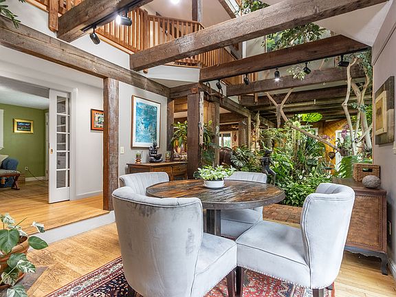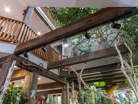 A true highlight of the home is the "Jungle Room" an indoor oasis unlike any other. This lush sanctuary features towering tropical foliage, a stunning 30' Ficus tree, and a tranquil pond, bringing nature indoors in the most spectacular way.