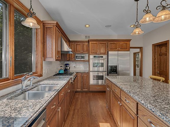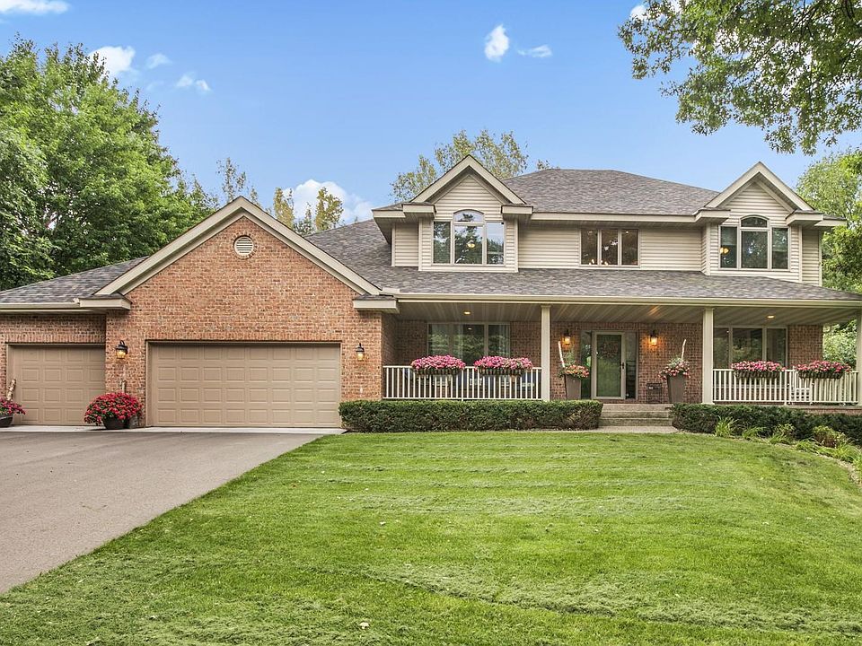 This stately two-story home in popular Tiffany Park Two sits on over a half-acre lot and offers a fantastic layout with four upper-level bedrooms. The main floor showcases refinished hardwood floors, a high-vaulted family room with a gas fireplace and generous windows, a gourmet kitchen with a large center island, granite countertops, tile backsplash, and high-end KitchenAid appliances including double wall ovens and a 36-inch gas cooktop! You’ll also find formal and informal dining spaces, a living room with fireplace, a den, laundry, and a charming half bath, all on the main level. The primary suite features a spacious full bath with dual vanities, and separate tub and shower, while the finished lower level includes a family room with wet bar and lookout windows, a dedicated exercise room, plus a fifth bedroom and a bath with tile shower. Rest easy with brick and steel siding, and a newer roof, and of course you will appreciate the oversized triple garage, maintenance free deck, and the massive backyard with a well for irrigation and a fenced garden area.