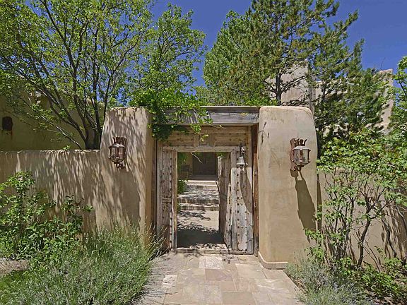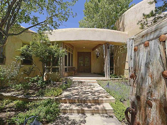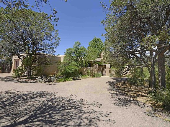 Innovative 2 bedroom 2.5 bath home in close in city location with stunning foothill views. Classic Santa Fe style wooden door welcomes you through a courtyard into a dramatic living/dining area with wood and skylighted ceilings, stylish fireplace, plenty of windows, and doors to the outside spacious circular portal. Large kitchen with kiva, center island, and walk-in pantry. Split bedroom floor plan for privacy and comfort for guests. Separate media room on the main floor plus a studio/office upstairs. On almost 1.8 acres. Just minutes from restaurants, shopping, medical, museums and downtown.