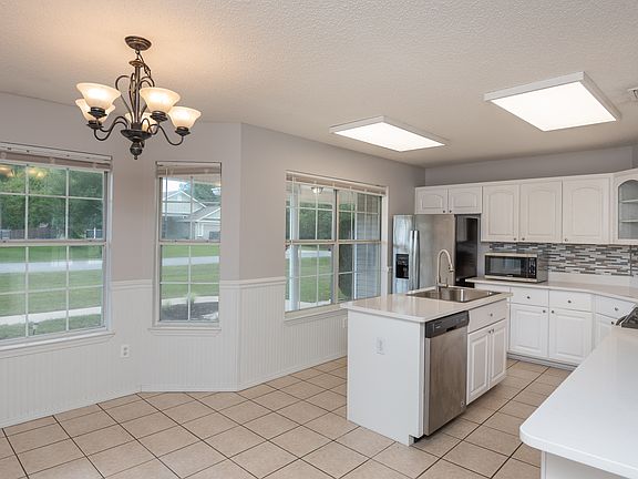 The large kitchen is a true highlight, featuring white shaker cabinets, a beautiful backsplash, stainless steel appliances, and an island that provides extra prep and storage space. A separate breakfast bar opens directly to the living area, making it easy to entertain or enjoy casual meals. Wainscoting details add extra charm, and the many windows throughout bring in plenty of natural light.