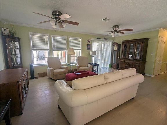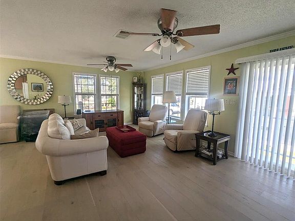 Welcome to #674 on the Queensway Nestled in a peaceful cul-de-sac, this delightful two-bedroom home offers comfort, convenience, and abundant storage space. The oversized covered driveway is ideal for both your vehicle and golf cart! This home features a lot of natural light with plenty of double pane windows and sliding glass doors! Fantastic updates include NEW Roof (2022) and NEW AC (2019) for peace of mind. Stylish wood flooring throughout the main living areas with crown molding adds a refined touch. Enjoy the spacious kitchen with ample counter space, farmhouse sink, and closet pantry. Open-concept living and dining area—perfect for entertaining. The Primary Bedroom is nice size and has an ensuite with dual sinks, walk-in closet, and walk-in shower. The Guest bedroom conveniently located near the guest bath with walk-in shower. This home boasts a large utility room with exterior door—ideal for unloading groceries with a Brand-new washer and generous storage options. This home is a must-see for anyone seeking comfort, style, and functionality in a serene setting. Home price includes certificate. Resident owned 55+ gated golf course community with an active resort lifestyle. Features an 18-hole, par 62 golf course, 5 tennis courts, bocce ball, lawn bowling, Shuffleboard courts, 4 heated swimming pools, 2 hot tubs, fitness facility, woodworking facility, 70+ clubs/activities, 4 pickleball courts, restaurant/bar, tiki hut/bar and much more. One indoor cat only, no dog allowed in an interior lot home.