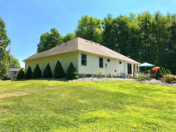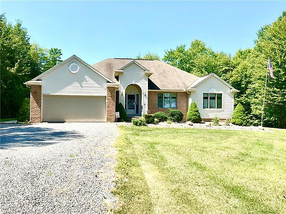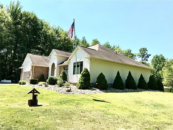 This beautiful brick-and-vinyl ranch is a rare find: a country setting with a gorgeous, expansive view of the valley between Ohio and Pennsylvania. Sitting on three acres -- half cleared, half still timbered with mature trees -- this spacious two-bedroom, two and a half-bath home has a master bath en suite, a main-floor laundry, a kitchen/dining area that leads to a large concrete patio overlooking the back acres. There are solar lights on the patio rail posts. The living room has a tray ceiling and corner fireplace. Do not mistake the tile flooring in the front foyer, bathrooms, and kitchen for ceramic. It is porcelain -- made from a finer clay making it denser and able to withstand outdoor conditions. Both the attached and back garages are wired for 220 lines. There is a waterline outside of the back garage. The attached garage has a wheelchair ramp and still provides room for two vehicles. The seller owns the 500 gallon LP fuel tank used to heat the home -- reducing costs considerably. There is up to $2,625 available paid in advance (see the disclosed spread sheet) The contract for the service is transferable to a new owner. Both the front sewing room and/or back office could be converted to another bedroom. The basement is partially finished, there are glass block windows, and the freezer stays!