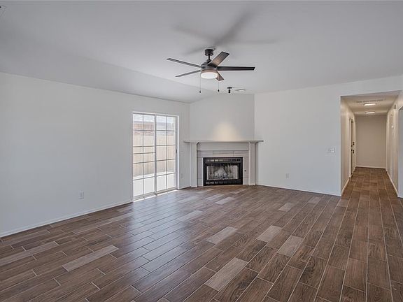 As you step inside, you'll be greeted by an inviting open-concept living area featuring stunning wood-look tile floors that flow seamlessly through the main living spaces. The bright and airy living room, complete with a cozy fireplace and a ceiling fan, offers a perfect setting for both relaxation and entertaining. Large windows and a sliding glass door flood the space with natural light.