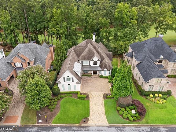 This timeless 4-sided brick estate blends classic architecture with today's most refined updates, all set on a beautifully landscaped lot with sweeping views of the 14th and 15th fairways of Country Club of the South. From the moment you arrive, the setting feels like a private retreat where every day begins and ends with resort-style views. A two-story foyer welcomes you with grand ceilings, streaming natural light, and the sparkle of brand-new Marvin windows and multiple French doors. The thoughtful floor plan transitions seamlessly between elegant entertaining spaces and relaxed everyday living. The heart of the home is the chef's kitchen featuring a spacious island with breakfast bar, custom cabinetry, and a perfect sightline into the vaulted fireside family room. Steps away, a richly appointed vaulted, wood-paneled office on the main level provides a private retreat for work or quiet study. The formal dining room sets the stage for memorable gatherings, while the main-level primary suite offers a peaceful escape with dual closets and a fully renovated spa bath. Upstairs, two generous ensuite bedrooms feature newly installed hardwoods, while the terrace level provides a private oversized suite with its own updated bath-perfect for in-laws, guests, or extended stays. In addition, the terrace level features spacious areas for TV and casual get-togethers, an exercise room, and approximately 1,000 square feet of unfinished storage space. Outdoors, manicured landscaping frames panoramic golf views, ideal for hosting friends or unwinding after a round. Practical updates abound: a three-car garage with new doors and an EV/RV hookup, smart thermostats, upgraded LED lighting, plus fresh paint throughout make this home truly move-in ready. Nestled within the gates of prestigious Country Club of the South, residents enjoy world-class amenities, top schools, and the security of one of North Atlanta's most desirable communities. This home is the perfect blend of timeless style, modern convenience, and an unmatched golf-course setting. Move in. Tee off. Live beautifully.