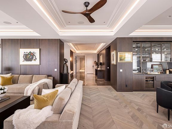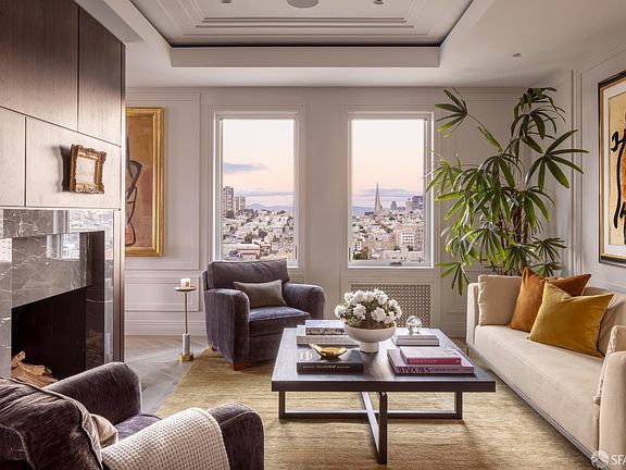 Atop a historic pre-war building in Pacific Heights, the Penthouse at 2100 Pacific Avenue has been transformed into a residence of rare precision equal parts sanctuary, showcase, and architectural statement. Conceived for a museum-caliber art collection, the 5,198 sqft three-bed home pairs refined design with sweeping, ever-changing Bay and skyline views. The open plan living and dining areas unfold to picture perfect vistas framed by herringbone oak floors and an aged brass dining bar with wine storage. The adjoining kitchen reveals a commanding island, high end appliances, and Golden Gate Bridge views from its casual dining area. Additional amenities include a wine room, service elevator, powder room, pantry, and systems room. Private quarters feature an office with built-ins and city views, a wood-paneled primary suite with fireplace, and spa-like bath with heated marble floors and dual water closets. Two ensuite bedrooms and a fitness room complete the wing. Sean Bailey Architects and FORMA Construction led the two year reimagination, integrating walnut paneling, hidden infrastructure, and programmable lighting. With 11' ceilings, radiant floors, doorman service, parking, and storage, this offering represents one of San Francisco's most significant penthouse residences
