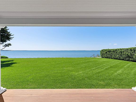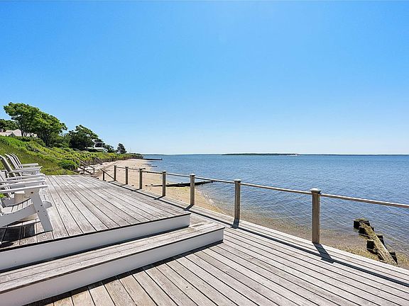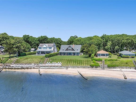 Welcome to a unique luxury waterfront estate, perfectly situated overlooking the Peconic Bay, with stunning views of Robin's Island and the Hamptons. With over 100 feet of sandy beach and surf, this custom-built residence features a guest house on the property, a lower-level waterside sun deck, and a covered mahogany porch. It's an ideal spot for early sunrises, enjoying the bay breeze, or admiring the beautifully landscaped lawn leading to the water's edge. The main house boasts premium finishes, fixtures, and detailed woodwork throughout. The open floor plan offers both elegance and comfort, flooded with natural light. New coffered ceilings, accented by reclaimed wood beams, provide architectural detail. The living room and formal dining room are anchored by a gas fireplace, which features built-in shelving and seating designed to maximize water views. The home is professionally decorated in a style that embodies a coastal lifestyle. The gourmet kitchen is equipped with high-end appliances, pearl white quartz countertops, custom cabinetry, a walk-in pantry, and a center island accented by a decorative reclaimed wood ceiling that defines the space. The main floor primary suite offers spectacular water views and private porch access. Its spa-inspired bathroom features double sinks, a soaking tub, and a beautifully tiled shower with bench seating. The suite also includes ample storage and a walk-in closet. Upstairs, you'll find two beautifully appointed bedrooms, a full bath, a bonus room, and two additional finished spaces suitable for storage or to be transformed into a gym, office, or recreation room. The guest house is also tastefully designed and well-equipped. It includes a retro eat-in kitchen, two charming bedrooms, a spacious living room with a wood-burning fireplace, quaint wood floors, a full bath, and on-site laundry. The outdoor bluestone patio is surrounded by lush greenery, creating a lovely ambiance for entertaining and al fresco dining. The property features mature, manicured landscaping and ample space for a water-facing pool or tennis court. Experience all that the North Fork and East End have to offer, conveniently located near the charming Love Lane, known for its delightful shopping and restaurant options, vineyards, and farm stands.