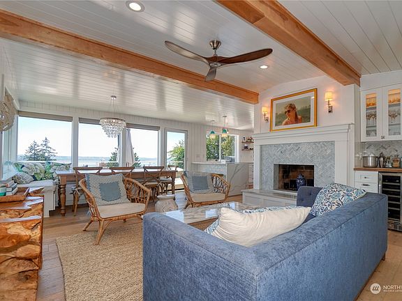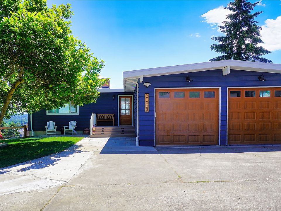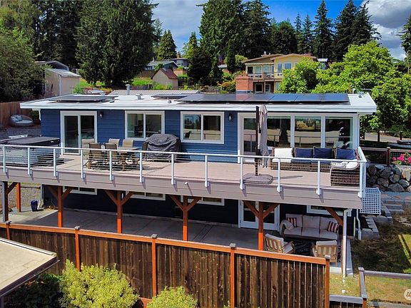 Sound & Mountain views home with amazing territorial views from both levels. Totally updated inside and out. Exquisite decor. Beautiful kitchen, expansive quartz counters. Built in dining room seating takes advantage of views. Delight yourself in the updated spa like main floor bath w/heated floors. Living room has built in cabinetry & fireplace. Downstairs are 2 more bedrooms plus expansive living spaces, family room w/fireplace. Enjoy your Hot tub on the deck engineered for it. The deck offers cover for the patio to make backyard useable year round. Blossom solar. Large Detached garage/shop has 220v & work space. Backyard with terraces, seating areas, firepit, garden & play areas. Fenced entry, RV parking.
