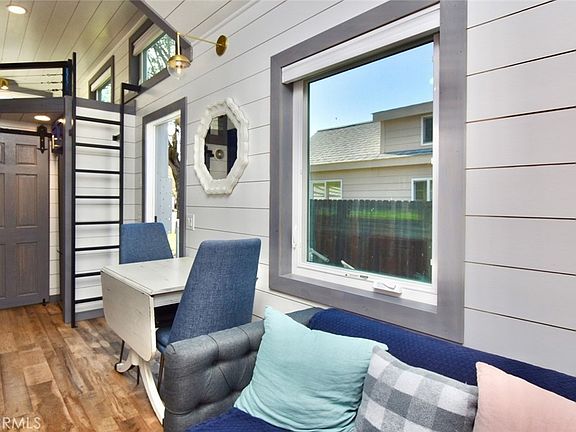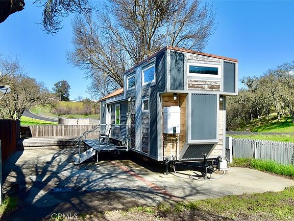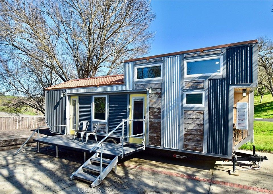 Year round get away at the lake! Quality construction tiny home on your own lot overlooking wooded greenbelt & seasonal creek. Turn-key w/modern country flare custom built by Movable Roots Tiny Homes. Spacious 330 s.f. + 2nd-floor loft bedroom. Fully furnished & designed for easy living. Light, bright & airy living room w/real wood floors, walls & vaulted ceilings w/comfortable sofa, wall mounted TV & built-in shelves. Fantastic kitchen w/solid surface counters complete w/deep farmhouse sink, reverse osmosis, shaker wood cabinets & stainless steel appliances including fridge, dishwasher, oven, burners & hood. Dining table can be opened up for guests. Barn style door leads to full size bathroom presenting large tiled shower w/glass doors, vessel sink & indoor laundry w/combination washer/dryer & extra cabinets. Another barn style door opens to private bedroom w/TV & glass door to deck w/built-in blinds. Permanent ladder to comfortable sleeping loft w/bird’s eye view of surrounding area. Clean & classy home features abundant dual pane windows, lots of lighting, split HVAC system & tankless water heater. Front porch deck flows onto huge entertainer’s deck overlooking adjacent greenbelt where you can spread out & enjoy nature among the trees featuring deer, turkey, varieties of birds & other critters on a daily basis. Corner lot features a concrete pad w/two sets of full RV hook-ups. Plenty of room to park boat, jet skis, golf cart, & guest vehicles. On wheels so if you decide to vacation elsewhere you can take your home with you! Close to park w/community bathrooms, showers & laundry facilities for a large crowd. These lots are in high demand; if you are interested be sure to check it out quickly. Enjoy good, clean fun w/family & friends at Heritage Ranch, a gated lake community with many amenities only a short walk or drive away including: Manned Security Gate • Roving Patrol • Private Marina & Launch Ramp to Lake Nacimiento • Campgrounds • Riding & Hiking Trails • Fitness Trails • Equestrian Center • Community Center • Senior Citizen’s Center • Tennis Courts • Basketball Courts • Baseball Diamond • Pickleball • Picnic Pavilion • Children’s Playgrounds • Swimming Pools • Dog Park • Churches • Library • Fire Department • Grocery store w/Butcher, Bakery & Deli • Gas Pumps & Propane Fill-up • Car/RV/Boat Wash • Coffee Shop • Pizzeria • Physical Therapy • Veterinary Clinic & more! Be sure to view 3D tour