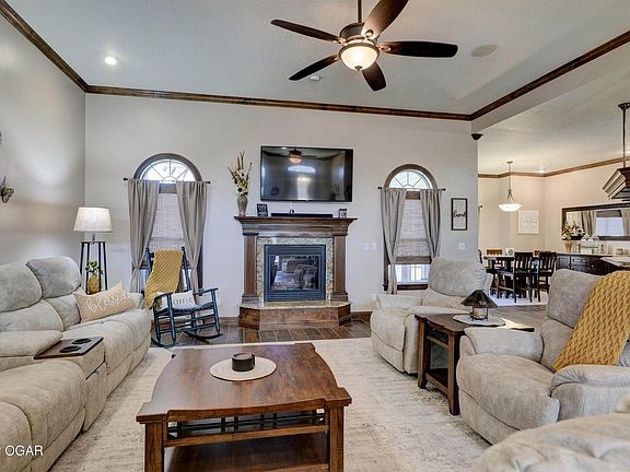 If this was your home....You could enjoy summer nights on the beautiful patio on the covered patio and firepit area. This one-level home features an open floor plan with new tile floors in the main living area. The dream kitchen has granite counter tops, a breakfast bar, eat-in area & stainless appliances (including a double oven!). The luxurious main bedroom has an en suite and incredible walk-in closet! The two bedrooms on the east side has a bath in between. The 4th bedroom in the front of house, would make the perfect office. In the 3-car garage, you'll find a walk-in storm shelter that will accommodate 6 adults.